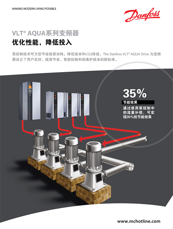模块式VLT FC202变频器使风机、水泵、以及轻过载型通用机械的控制省心省力、得心应手。功率范围从0.25kW至1.4MW。在任何工业的泵、风机等变转矩应用中,VLT FC202系列变频器都能取得较高的传动质量和显著的节能效果。对于各类流体、气体输送处理,只要你列出需要,我们就能给出解决方案。对于轻过载的恒转矩通用机械,如空气压缩机、传送带、流水线、泥浆泵等负载,VLT FC202系列变频器都能提供优秀的驱动性能以及标准配置的专用功能。