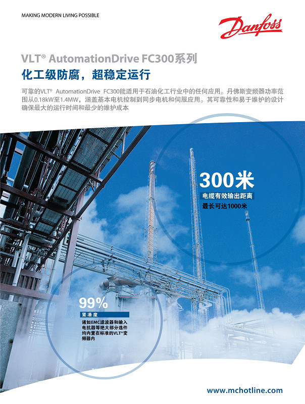 VLT AutomationDrive FC300系列是实现工厂大规模生产的高度可定制化的 变频调速器。升级和选件的使用方便简易、即插即用。VLT AutomationDrive FC300采用了一种变频器控制的理念,通过一种变频器控制任何机器或生产线上从标准到伺服控制的全部运行。标准版本变频器的功能非常广泛,包括PLC功能、电机控制的自动微调和性能的自分析,以及定位、同步、负荷预估,甚至伺服性能。所有版本的变频器都具有相同的用户界面,因此,只要用户使用过一台,就能操作所有变频器。