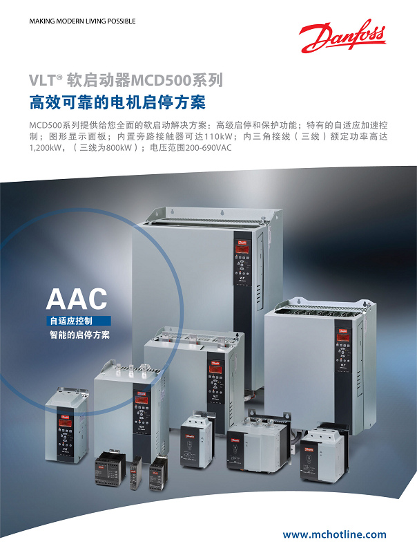 VLT®软启动器MCD500 是一个全面的电机启动解决方案。电流互感器检测电机电流,为受控电机斜坡上升曲线的实现提供反馈。自适应加速控制 (AAC) 根据不同应用对象自动选用最佳启动和停车曲线。自适应控制器意味着对于每一次启动和停止,软启动器会用实际运行过程和选定的最适合对象的曲线 作比较然后作出调整。VLT®软启动器MCD500有一个四行的图形显示器和一个易于编程的逻辑键盘。高级设置能够显示运行状态。三菜单系统:快捷菜单、应用设置和主菜单提供了最恰当的编程方法。用于更多应用对象的完美解决方案,例如:水泵\传送带\风机\搅拌机\压缩机\离心机\压榨机\锯\以及其它装置。
