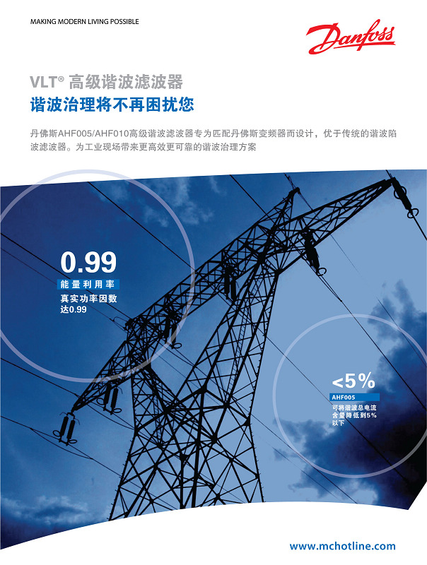 丹佛斯高级谐波滤波器为解决其它谐波滤波器性能与设计和丹佛斯变频器不匹配而专门设计的。与传统谐波陷波滤波器相比,VLT FC系列产品占用面积更小,谐波抑制能力更强。这种解决方案有两个型号:AHF005和AHF010。当连接在丹佛斯VLT变频器前端时,所产生的返回至电源的谐波电流扰动降低至满负载时总谐波电流扰动的5%和10%。效率超过98%,功率可到250kW,无源高级谐波滤波器提供了具有高性价比和坚固耐用的谐波解决方案。作为独立选项,高级谐波滤波器采用紧凑型机柜,易于安装到现有的安装面板内,因此,特别适合因变频器的位置调整受到限制的项目改造应用场合。