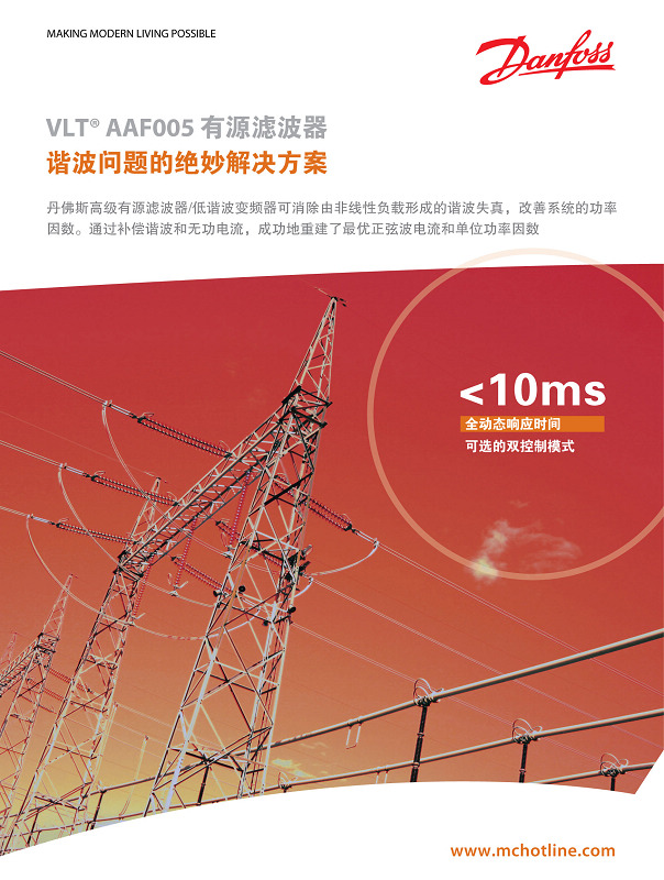 下列应用的完美解决方案:改善电网质量\增加网络容量\增加发电机功率\满足紧凑改造要求\确保敏感环境的安全\实现节能。电压范围:380-480 V 交流50-60 Hz。功率范围:190 A, 250 A, 310 A, 400 A, 500 A.最多四个单元并联,实现最大功率。丹佛斯高级有源滤波器可消除由非线性负载形成的谐波失真,改善系统的功率因数。VLT电力电子技术通过补偿谐波和无功电流,成功地重建了最优正弦波电流和单位功率因数。丹佛斯高级有源滤波器可作为对单个VLT 变频器的谐波解决方案安装在公共耦合点,同时补偿多个负载。丹佛斯有源滤波器可以通过和变压器配合使用,用于中高压环境下的谐波治理。
