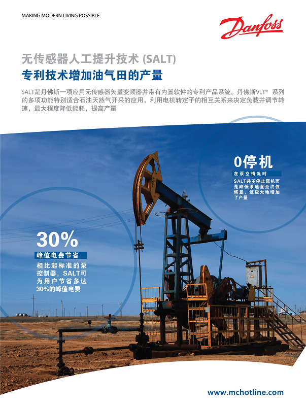 专利无传感器抽油机控制系统(SALT)使用带内置抽油控制软件的无传感器的矢量变频器。此系统性能卓越,是当前市场上同类产品中的佼佼者。丹佛斯VLT系列变频器的多项功能特别适合石油开采的应用,利用电机转定子的相互关系来决定负载并调节转速。丹佛斯是全球变频器技术当之无愧的业界领袖,依靠强大的服务与技术支持网络,为用户不断提供前沿技术及创新产品。年销售额$40亿。 标准的泵空控制器在低产量期间会关闭泵机。而SALT则只会降低泵速,在降低能耗和机械应力的同事,维持生产并最大程度地提升生产率。 SALT还具有报警功能,报警记录都将保留在日志中。所有这些功能都内置在变频器内,无需外部接口或泵控制卡。 SALT几乎可用于所有类型的井下抽油泵,包括有杆泵,螺杆泵以及潜油泵等。