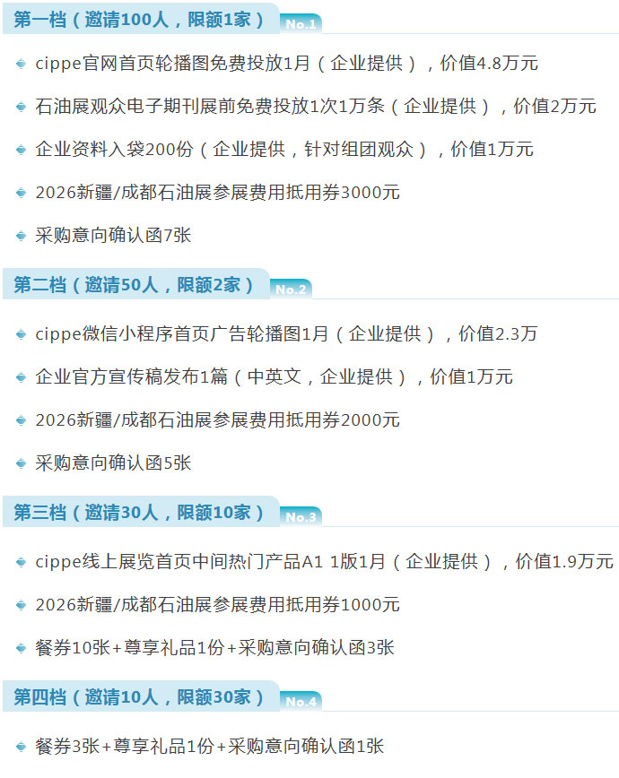 行业盛会启幕在即,福利狂欢同步来袭!2026年3月26-28日,一年一度的世界石油天然气大会——第二十六届中国国际石油石化技术装备展览会(cippe2026)将在中国国际展览中心(顺义馆)举办。大会组委会为助力展商拓展商机、回馈专业观众支持,特别推出多维度福利活动——展商邀观解锁四档豪华礼遇,观众登记尊享双重惊喜,签单更有重磅现金红包!机会难得,先到先得,邀您共赴这场兼具商机与福利的行业盛宴!