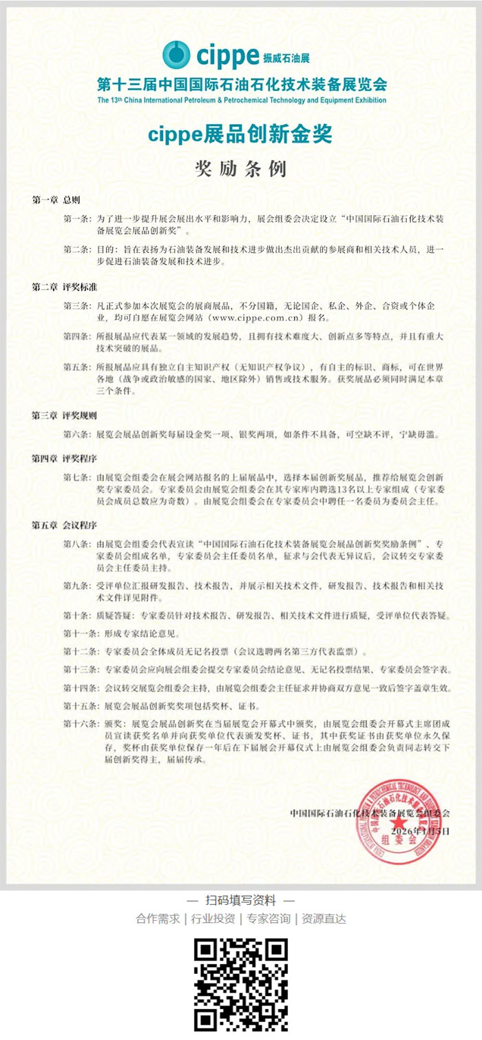 目前,cippe2026展品创新金奖(含银奖)申报通道已同步开放,申报截止时间为2026年3月10日。诚邀全球石油石化装备参展企业把握机遇,亮出你的创新硬实力,与行业精英同台竞技,争夺这份象征行业创新高度的权威荣誉!