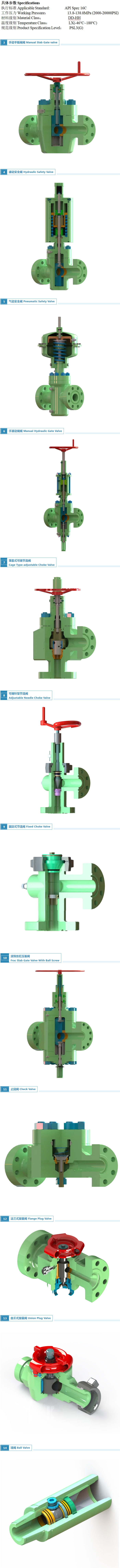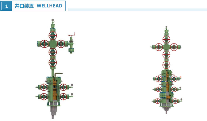 核心部件包括:套管头、油管四通、采油树、卡瓦悬挂器、曼德尔悬挂器、阀门、背压阀(BPV)等,所有部件均符合 API 6A 标准制造。