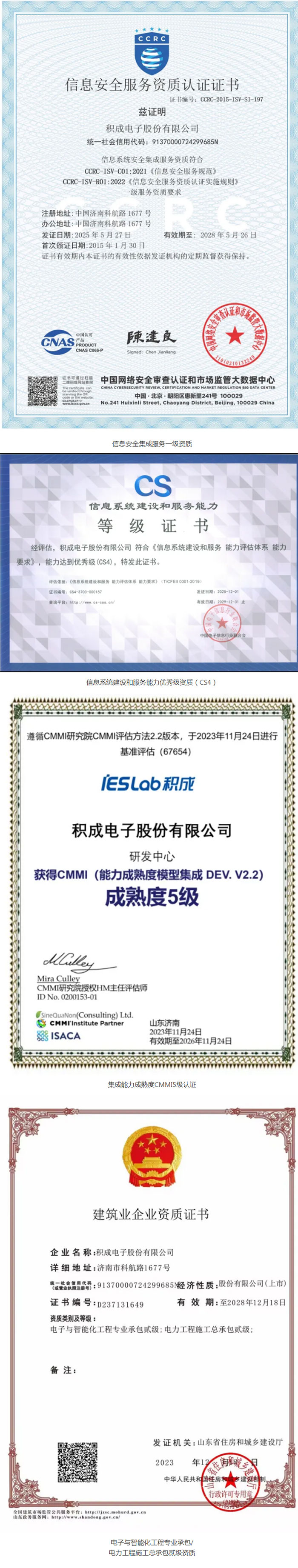 公司主持或参与200余项国际、国家和行业标准的制定,拥有1400余项技术专利和软件著作权,核心产品荣获国家科学技术进步二等奖。公司通过ISO9001、ISO14001、ISO45001、ISO/IEC27001、ISO/IEC20000、ISO28000、CMMI5、ITSS等权威认证,拥有国家信息安全集成服务一级、信息系统建设和服务能力优秀级(CS4级)、电力工程施工总承包贰级资质。