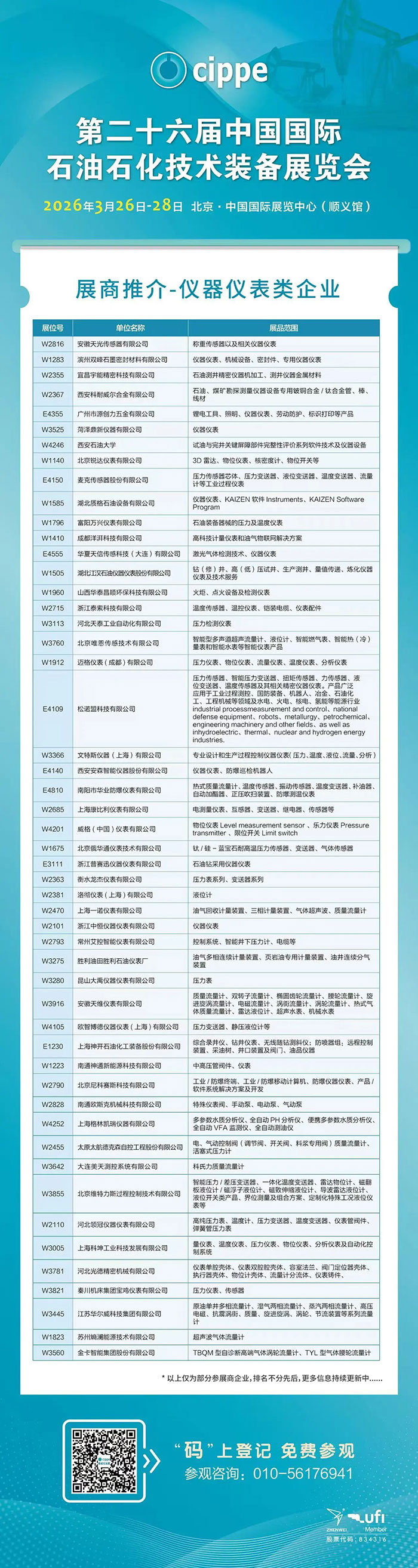 第二十六届中国国际石油石化技术装备展览会(cippe2026)将于2026 年 3 月 26 日 - 28 日在北京・中国国际展览中心(顺义馆)盛大启幕。作为全球石油石化行业的风向标展会,本届展会汇聚了众多深耕仪器仪表领域的领军企业,覆盖压力测量、流量计量、物位检测、气体分析等全产业链,从智能压力 / 差压变送器到多相流高精度计量装置,从激光气体检测技术到物位仪表智能化解决方案,共同擘画行业高质量发展新蓝图。