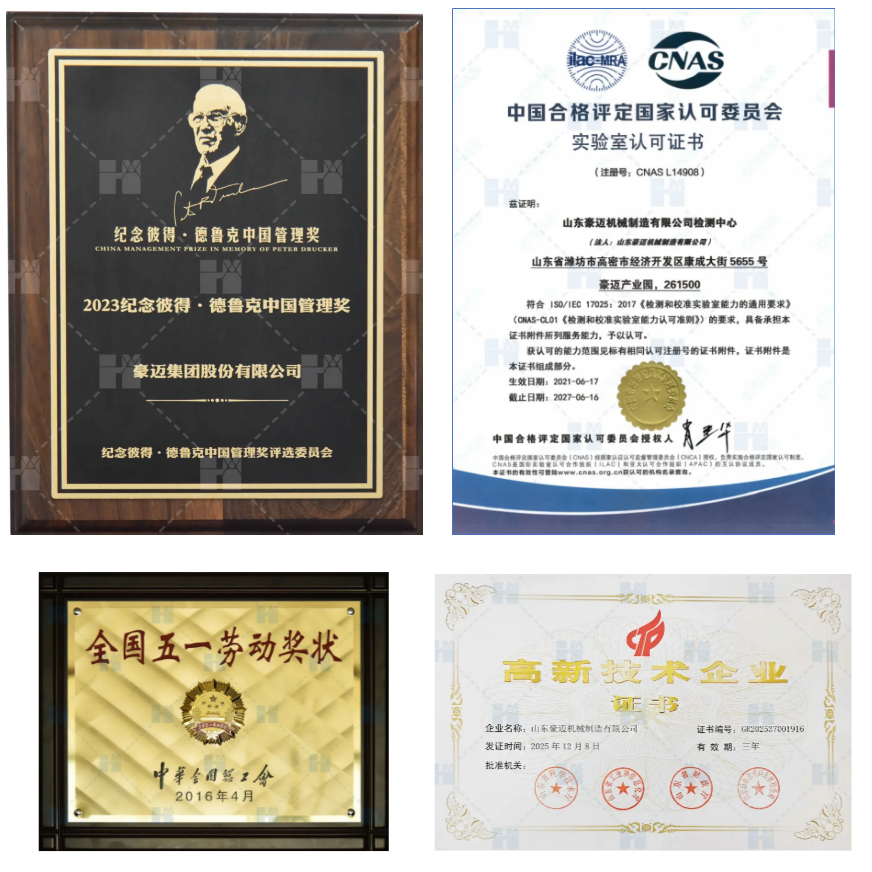 豪迈是国家制造业单项冠军企业、国家绿色工厂、国家高新技术企业、山东省“十强”产业集群领军企业、国家知识产权示范企业、省技术创新示范企业。承担省级以上研发项目159项,累计授权专利2540件(其中发明专利611项)。主持制定国家/行业/团体标准50项。设有省级企业技术中心、省级工程研究中心、省级工业设计中心等研发平台16处,与上海交通大学、西安交通大学、中国海洋大学等多所高校就产业关键共性技术进行联合研发。