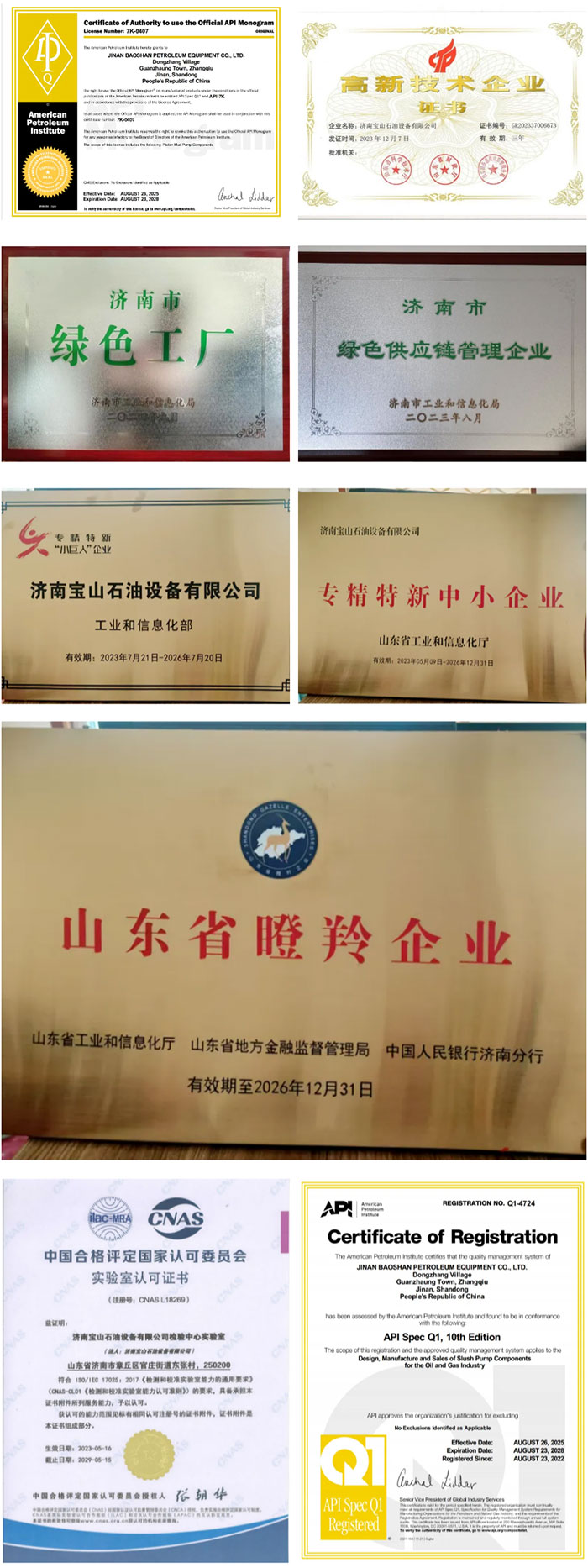 济南宝山石油设备有限公司,始终以"科技驱动·品质立业"为核心理念,成长为集研发、制造、销售于一体的国家级高新技术企业,专注于高端泥浆泵、柱塞泵及泵配件的生产制造。公司获得省级专精特新“小巨人”企业、省级瞪羚企业、省级专精特新企业、高新技术企业、绿色工厂、绿色供应链等多项荣誉,并依托美国API 7K、APIQ1、三体系认证 ISO 9001/14001/18001、以及CNAS国家级实验室资质和 ASEM专项认证,构建起全流程质量管理体系,配备先进齐全的生产加工设备,持续优化生产工艺,确保为每一个客户提供品质优良的高性能产品。